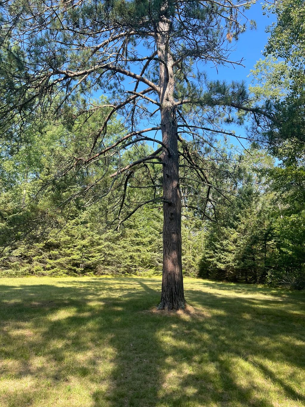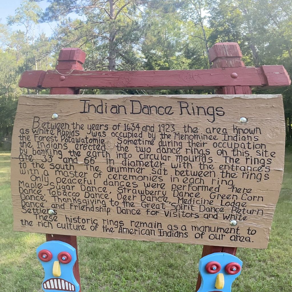 Sign and behind the great pine tree at Native American dance rings on summer cloud road wausaukee Wisconsin.